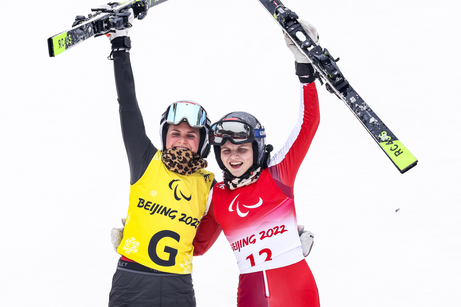 Rennläufer:innen fahren mit zwei Skiern und Prothesen: doppelte Unterschenkelamputation, leichte Muskelschwäche in beiden Beinen, Athetose und Ataxie, eingeschränkte Bewegungskoordination in den Beinen