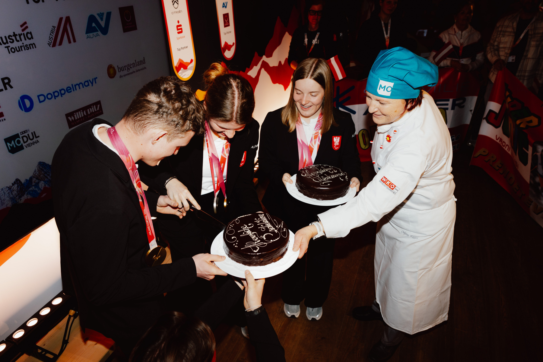 Wie bereits am Samstag gab es jeweils eine Sachertorte vom MODUL. Veronika Aigner vergewisserte sich prompt: „Ist das noch immer die selbe Torte?“ Die Antwort: Nein, bei jedem Medaillengewinn gibt es eine frische Torte. Daraufhin wurde die aktuelle Torte angeschnitten und aufgeteilt.