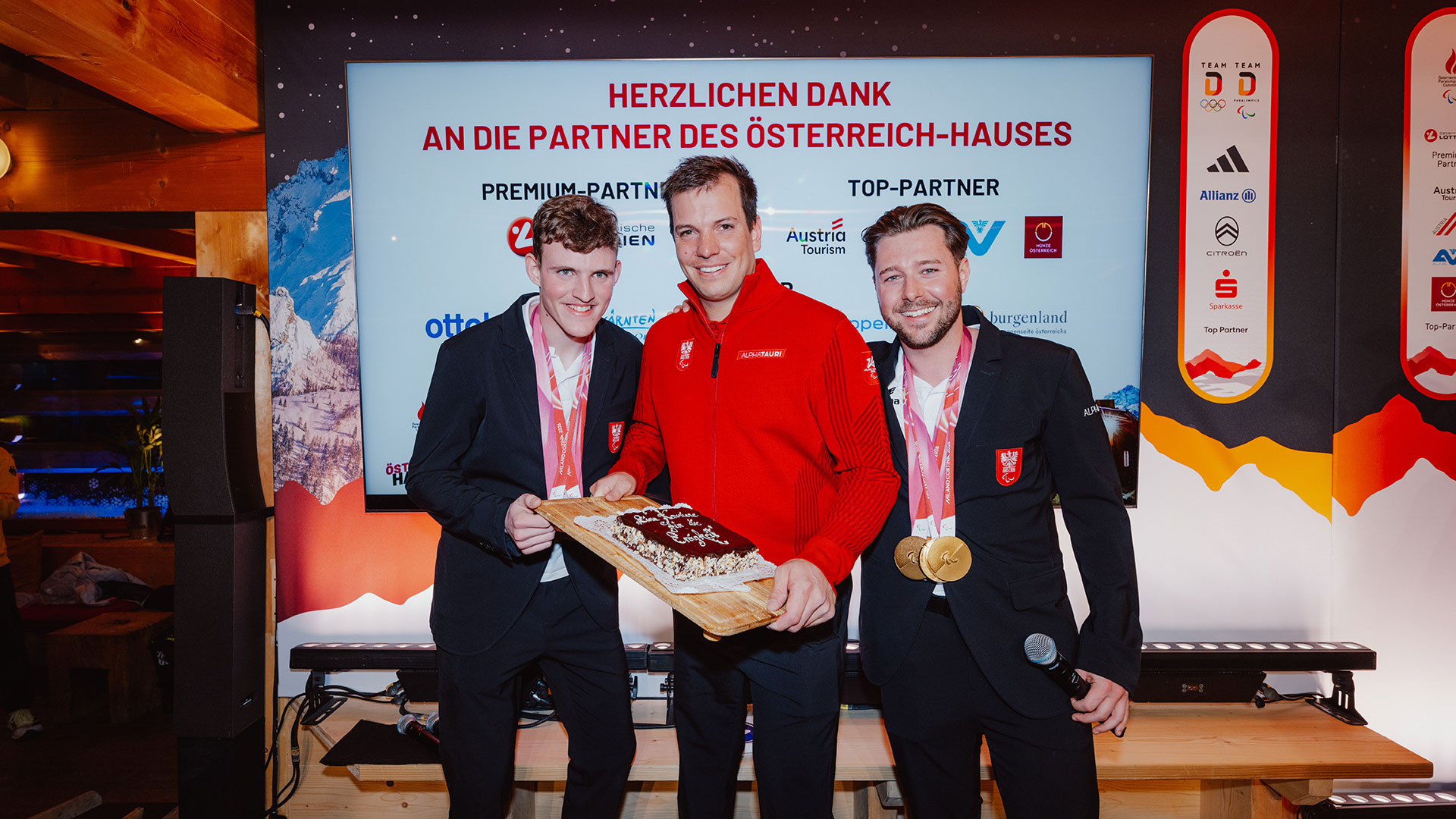 Neben der Partnerschaft stand auch der sportliche Erfolg im Mittelpunkt des Abends. Gefeiert wurde die Goldmedaille von Johannes Aigner und seinem Guide Nico Haberl im Riesentorlauf. Unter dem Jubel der Gäste zogen die beiden in das Österreich-Haus ein und wurden auf der Bühne gebührend gefeiert.