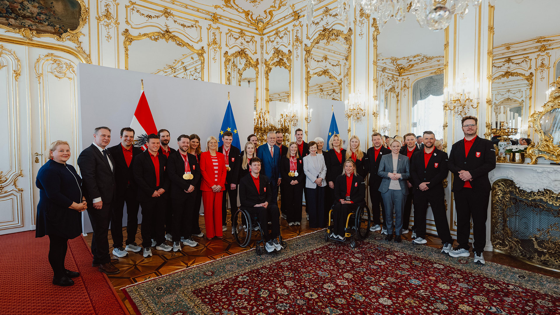 Vier Tage nach der Schlussfeier der Paralympics in Cortina kamen die Athlet:innen und Betreuer:innen noch einmal zusammen. In den Anzügen von AlphaTauri machte die rot-weiß-rote Delegation gute Figur. Neben Bundespräsident Alexander Van der Bellen waren auch Vizekanzler und Sportminister Andreas Babler, Verteidigungsministerin Klaudia Tanner, Sozialministerin Korinna Schumann und Sport-Staatssekretärin Michaela Schmidt anwesend.
